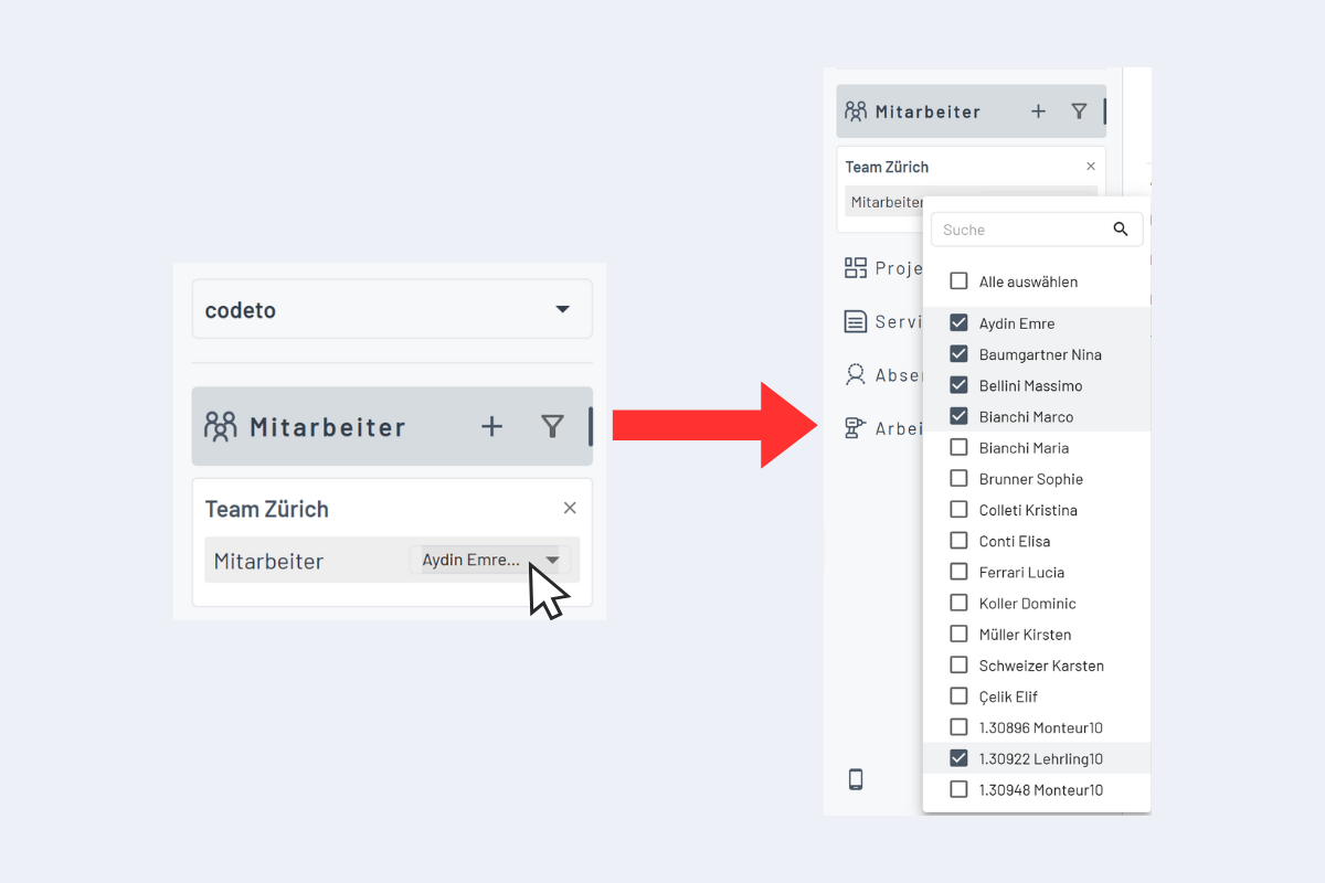 Active filters can also be adjusted temporarily right in the sidebar. Useful if you want to test the impact on utilization by adding extra employees to a team filter without changing the original filter.