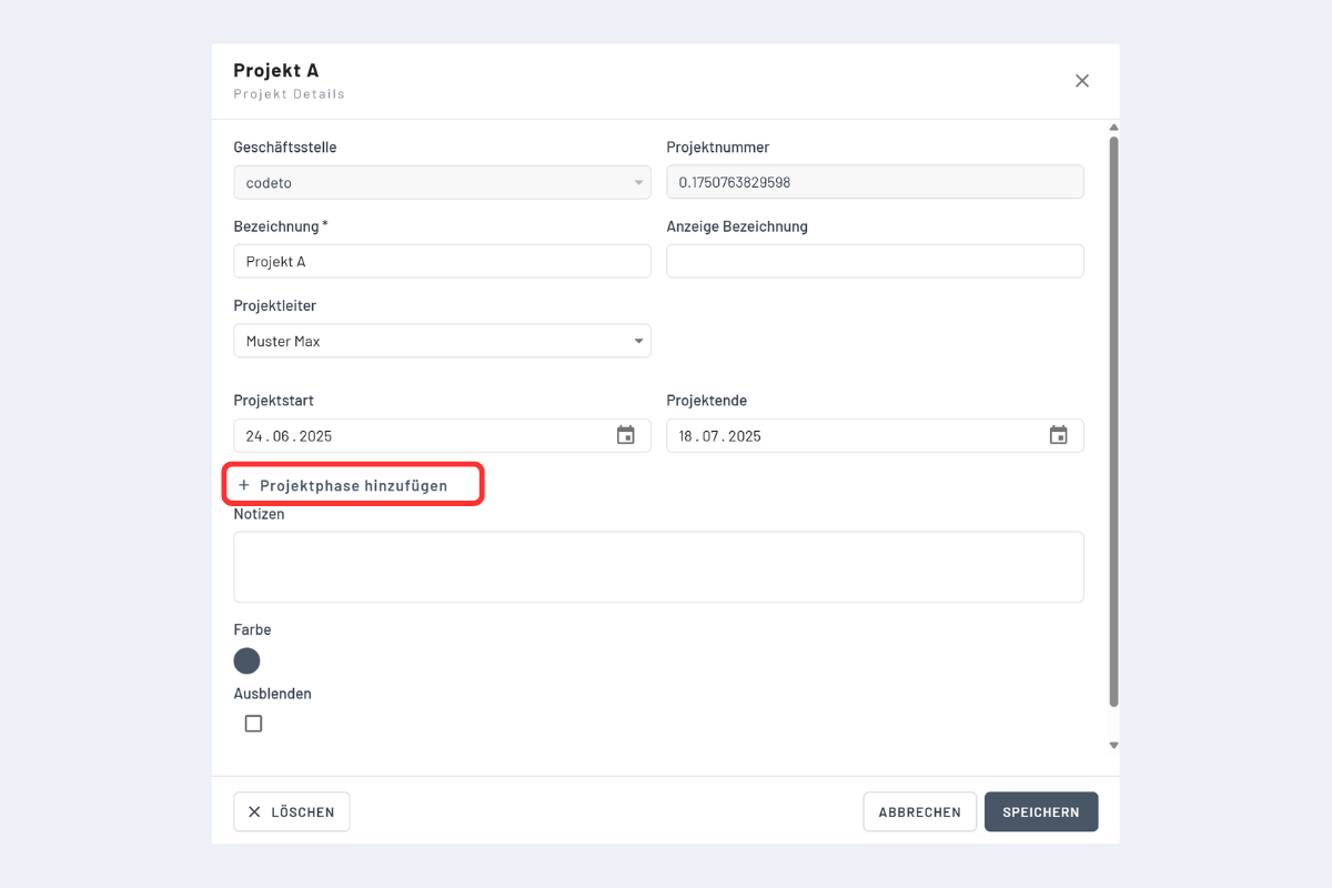 Les phases peuvent être ajoutées lors de la création d'un nouveau projet ou ultérieurement sur des projets existants. Ouvrez le projet souhaité – une fenêtre d'édition des données du projet s'affiche.