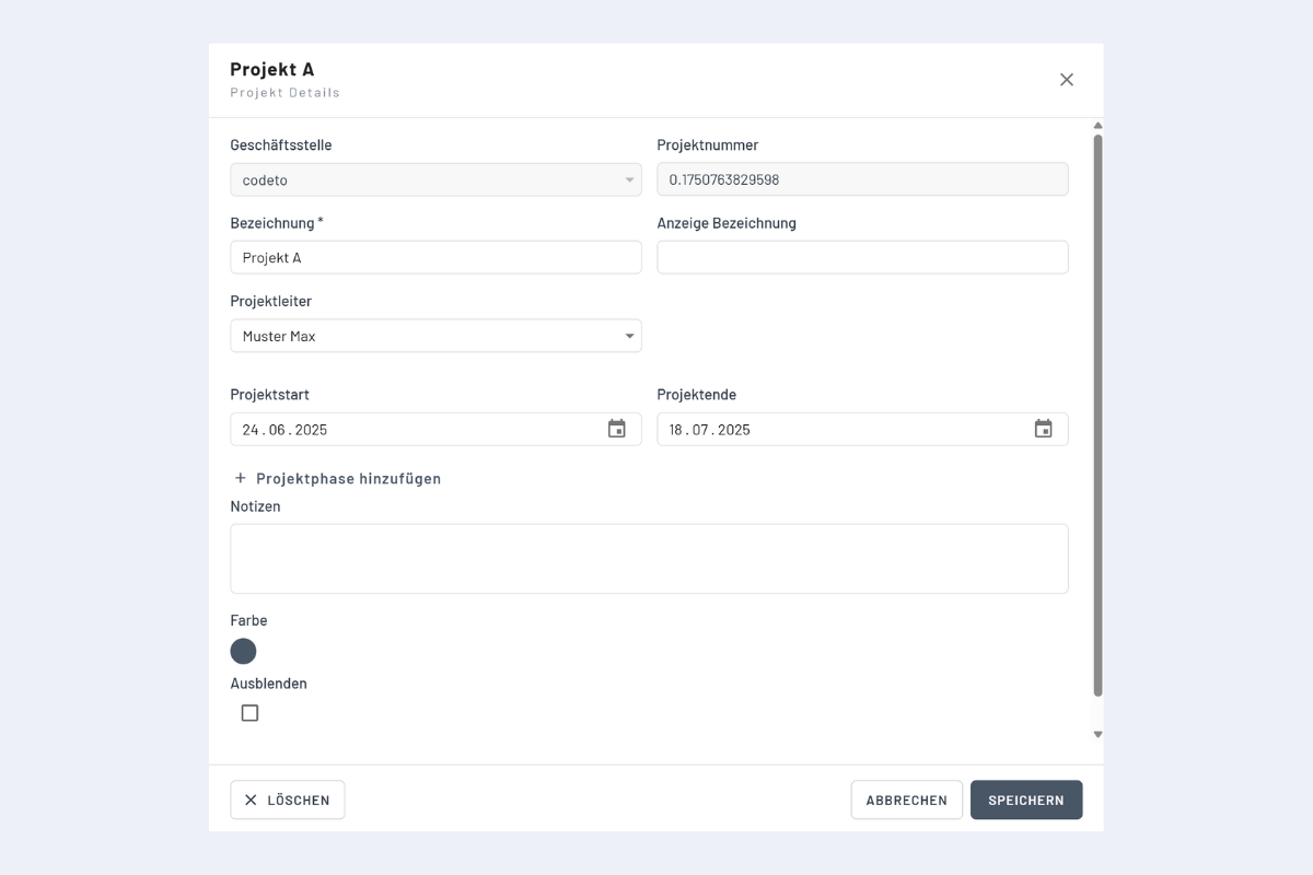 Come mostrare nuovamente un progetto nascosto è descritto nel capitolo Dipendenti / Nascondere e mostrare i dipendenti. Il processo funziona allo stesso modo per progetti e dipendenti.
